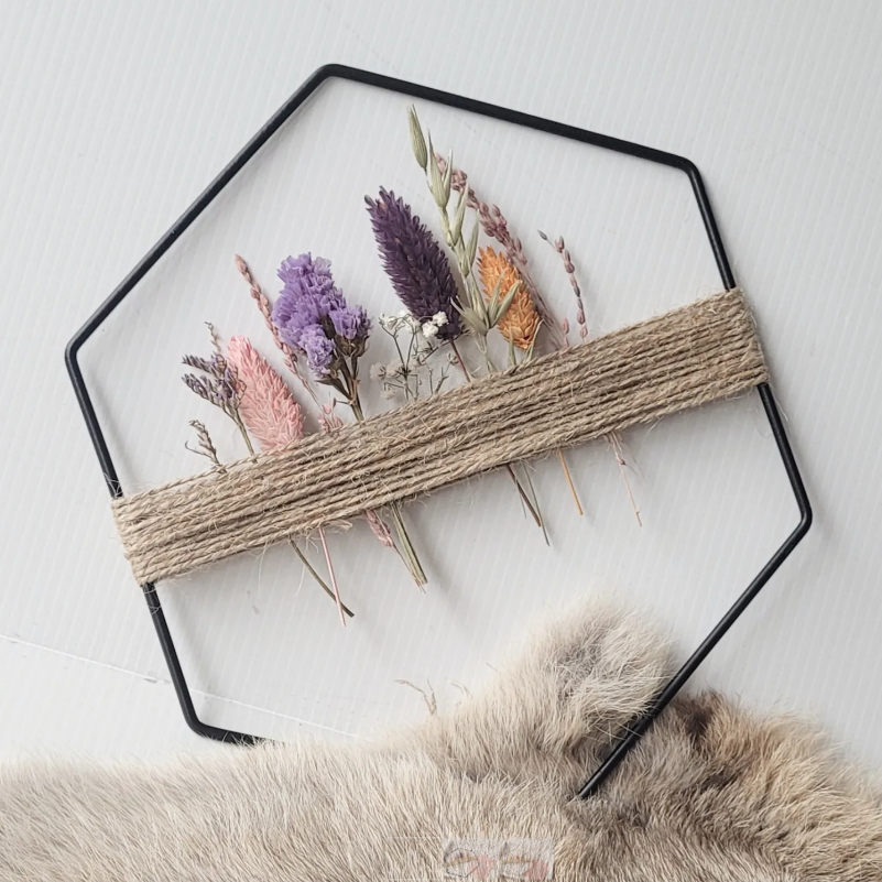 Der Hexagon wird mit schönen Trockenblumen versehen.