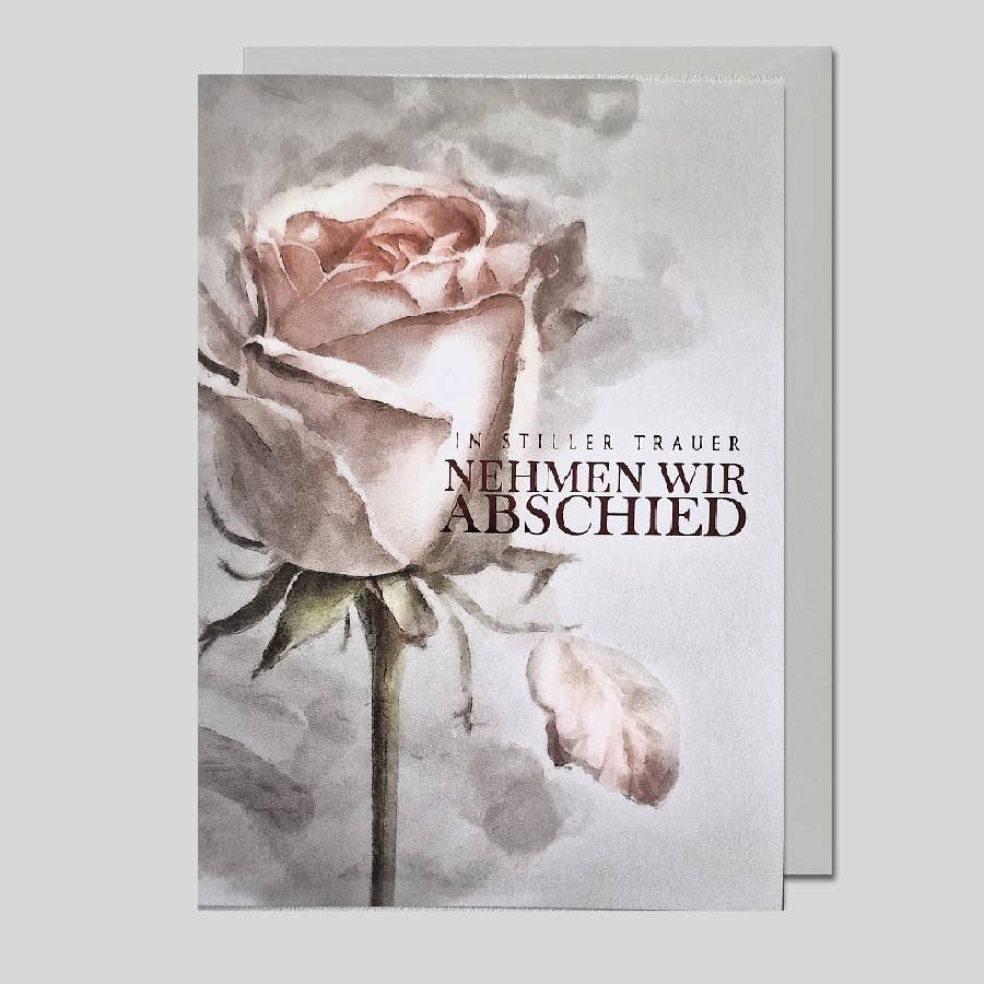 Trauerkarte "In stiller Trauer nehmen wir Abschied", der Texte wurde mit dunkel-roter Heißfolie geprägt. Kartenformat 12 x 17 cm. Lieferung mit farblich passendem Umschlag.