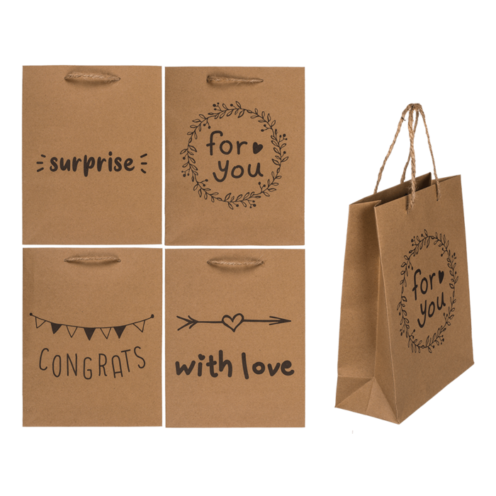 Kraftpapiertüte, For you, Congrats, With love, Surprise, ca. 18 x 8 x 23 cm, 4 Esel., 12 Stk. pro Mehrzwecktasche - Ein Geschenk ist nur dann perfekt, wenn es bis ins letzte Detail durchdacht wurde. Sogar bis zur Geschenkverpackung! Mit einer Geschenktüte haben Sie daher das perfekte Detail und verpacken das Geschenk in Sekundenbruchteilen. Sie sind nicht nur eine unglaublich schnelle Lösung für diejenigen, die nicht so gut Geschenke verpacken können, sie können auch beliebig oft wiederverwendet werden! Die Bastelpapiertüten verfügen über Kordelgriffe, die den Transport des Geschenks erleichtern. Dank des Materials verwenden Sie sogar nachhaltige Verpackungsprodukte!