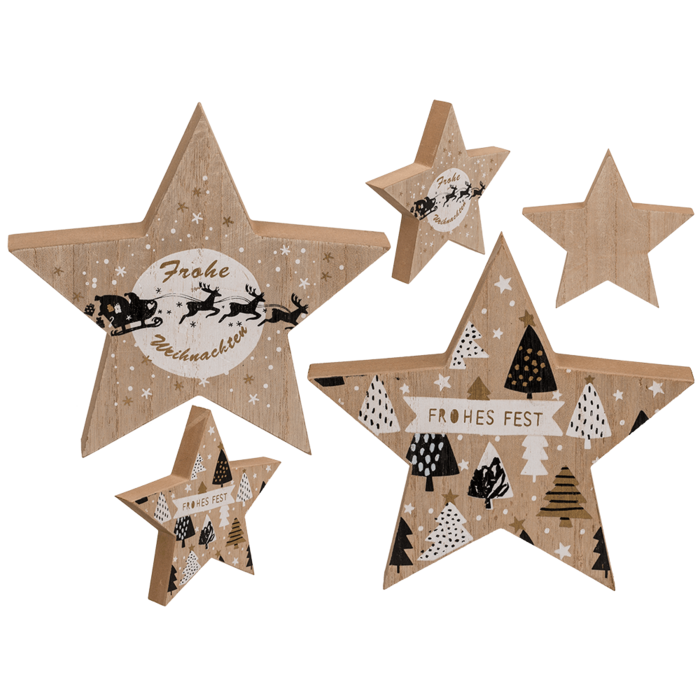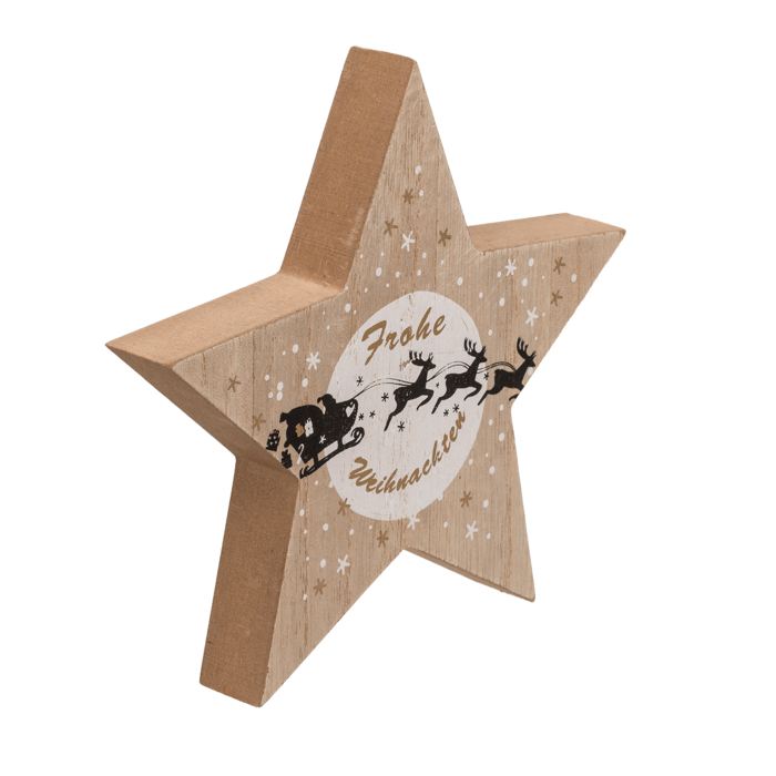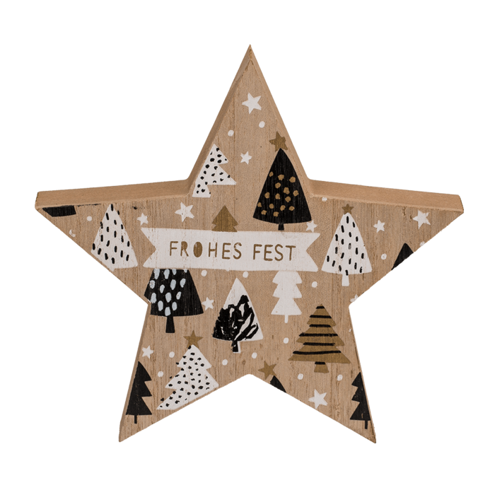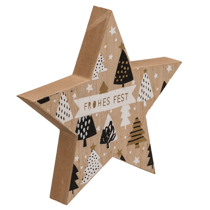 Stehender Holzstern mit schwarz/weißer Verzierung, ca. 15 x 2 x 15 cm, 2 sortiert - Der Holzstern ist ein optimales Herzstück für Ihr Weihnachtsessen. Das natürliche Design der Dekoration strahlt eine wunderbar festliche Atmosphäre aus und fügt sich optisch in jeden Haushalt ein. Bei optimaler Lagerung kann der Stern jedes Jahr wieder verwendet werden. Wir empfehlen, den Stern auch als Geschenkoption zu verwenden.
