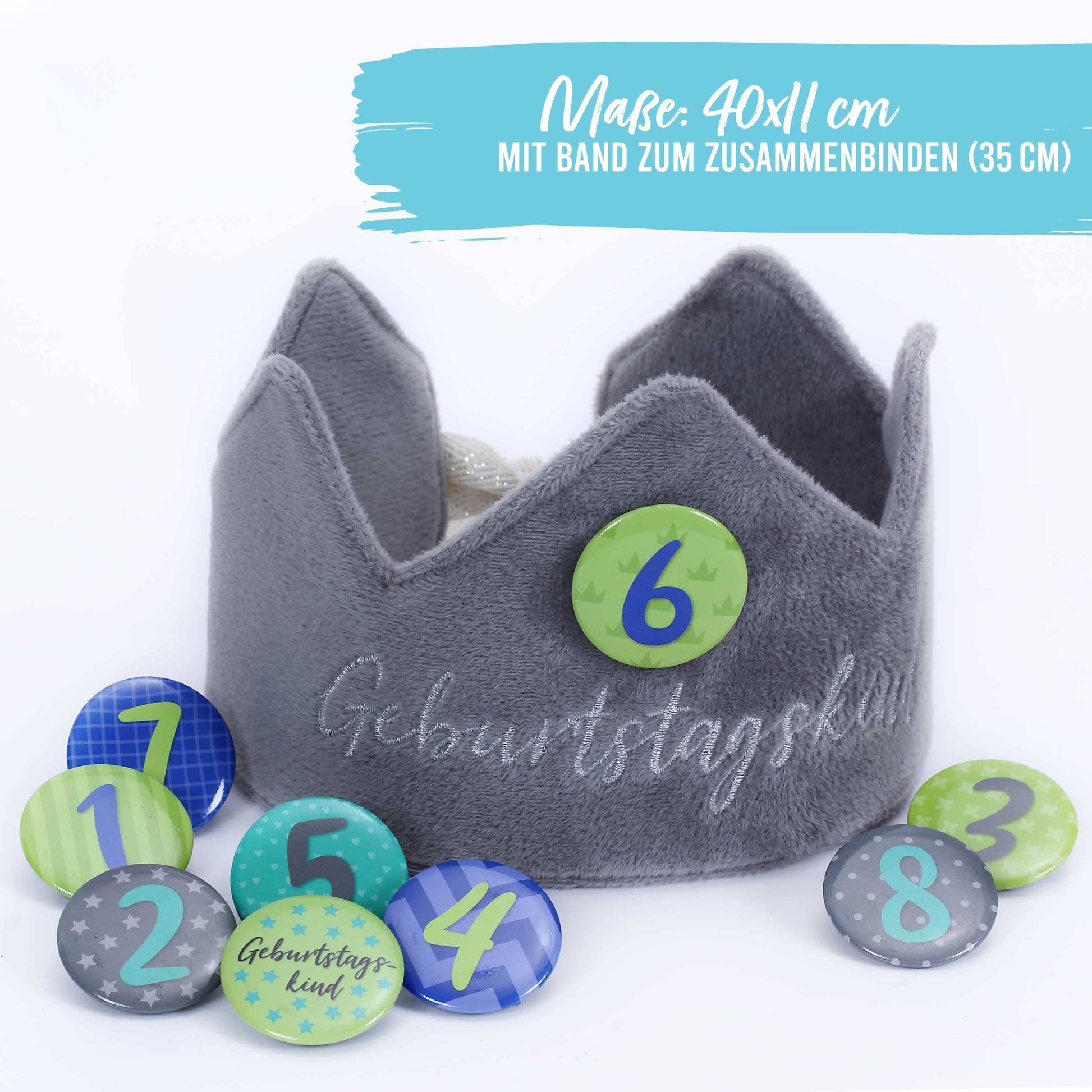 Produktname: Papierdrachen Geburtstagskrone Samt mit Zahlen - Grau - für den Kindergeburtstag - Krone aus Samtstoff mit Button Zahlen von 1-8 | Party Deko Hut für Jungen & Mädchen - Set 5