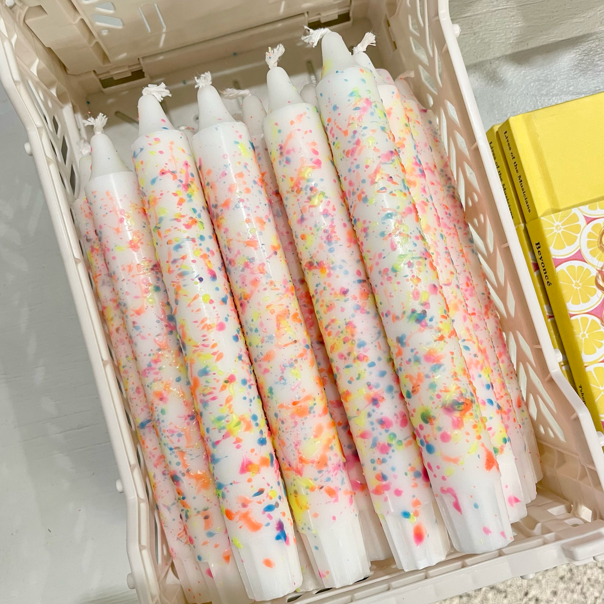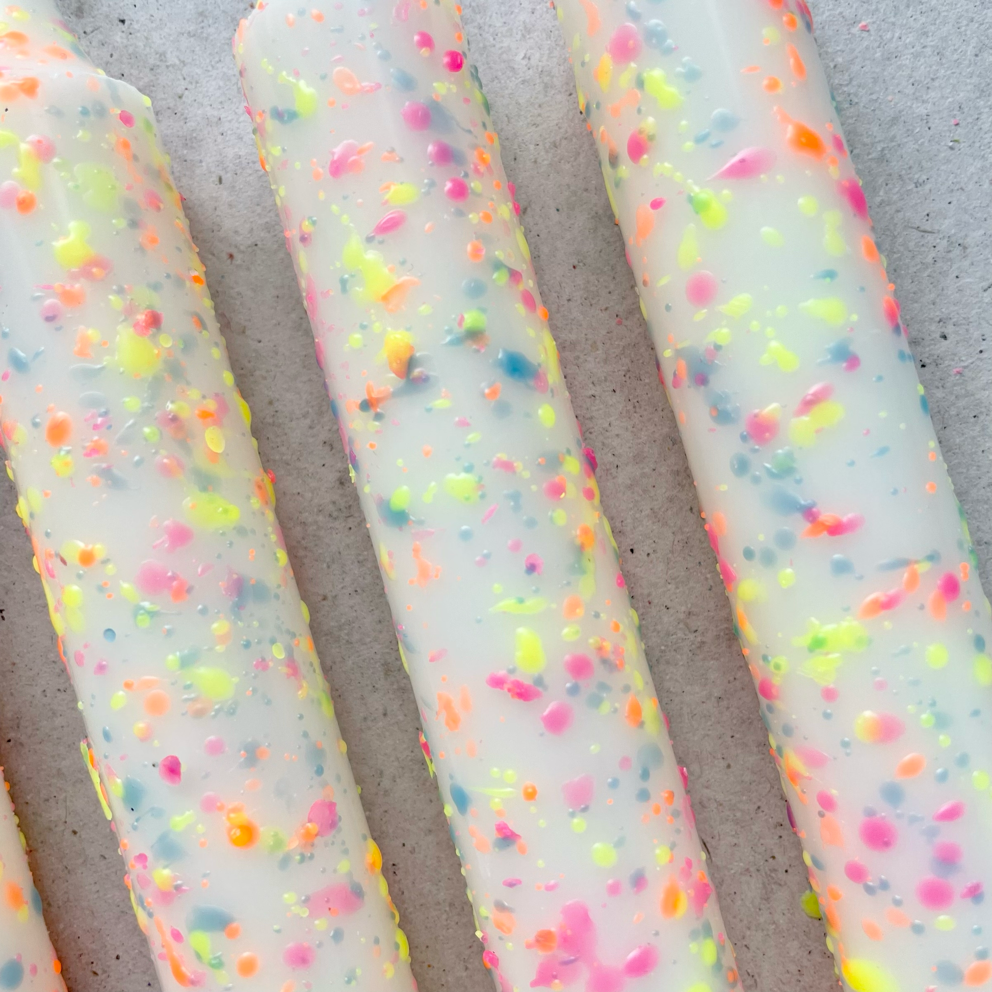Farben: weiße Kerze, Neon-Sprenkel (neon-pink, neon-orange, neon-gelb) & blau